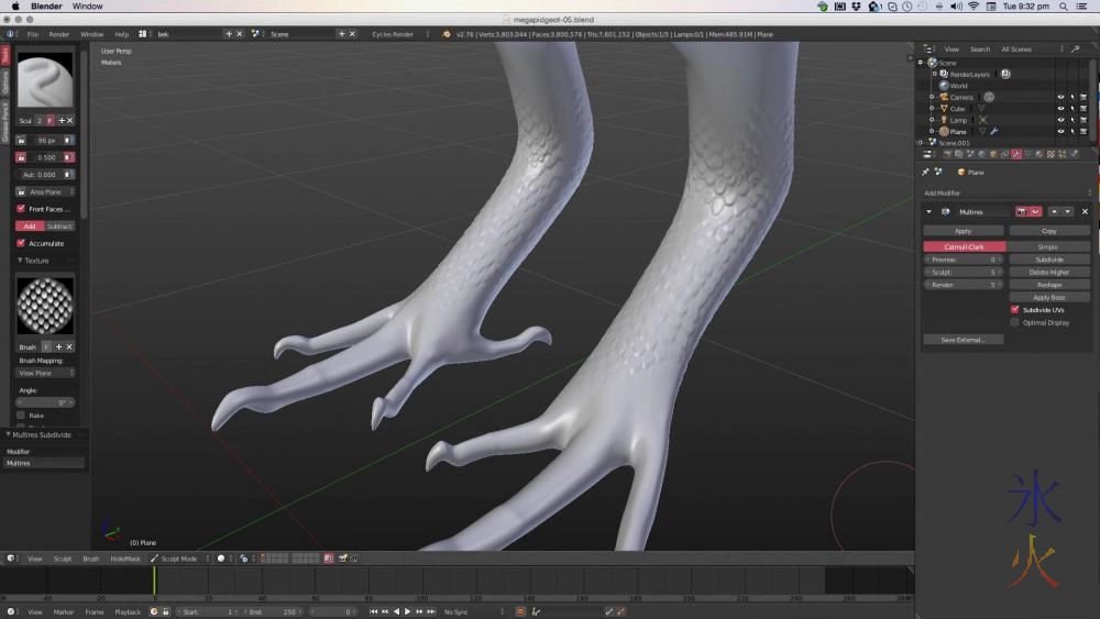 I found an awesome ‘dragonscale brush’ by DennisH2010 on Blendswap. I couldn’t get it to work following the instructions on a dynatopo sculpt but it worked nicely after simply appending the ‘Brush’ in the texture folder on multires with 5 subdivision levels.
