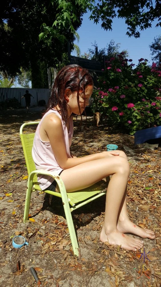 10yo has been looking up Youtube videos and making her own beauty products. The latest experiment was dying her hair with food colouring. We tried red as red stays in my hair really well so we figured it would stay in hers. She followed someone else’s recipe involving red food colouring and conditioner and sat out in the sun for a while letting it dry and set before wrapping her hair in a plastic bag to try to set the stains.