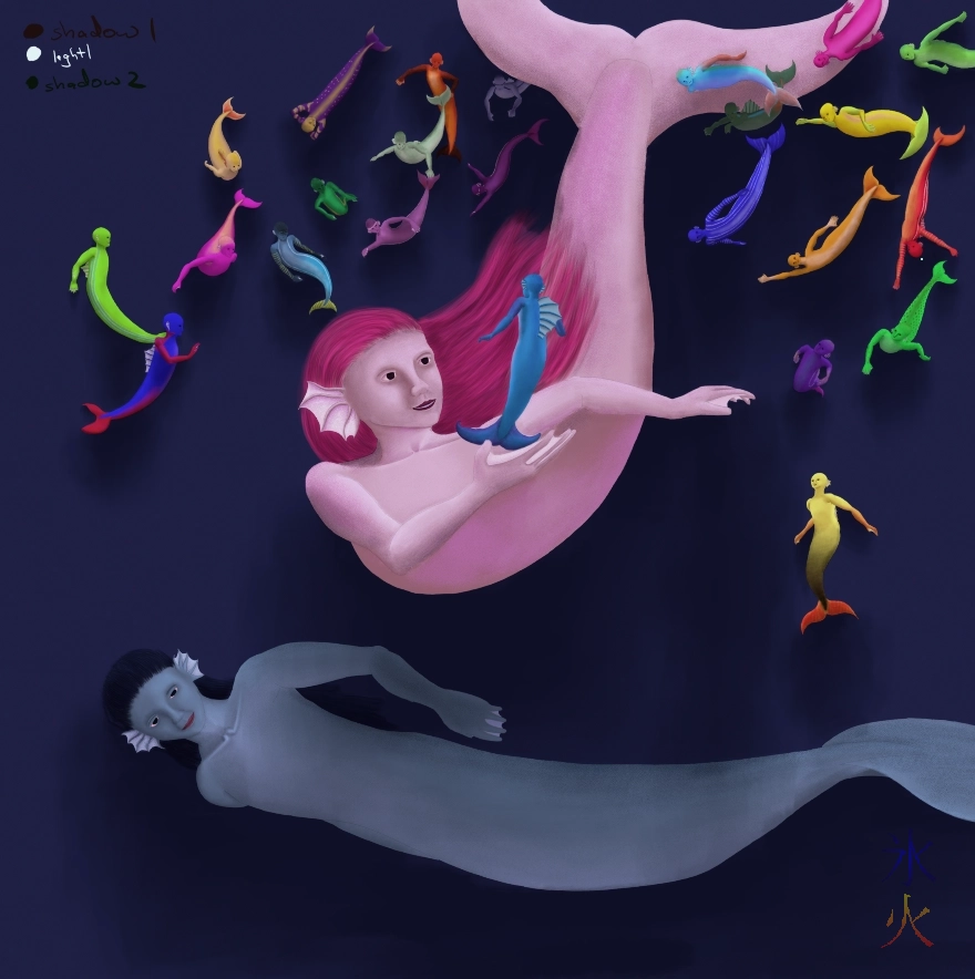 Last progblog I was starting to work on patterning the merminnows with help from my frenemy Google Image Search (for minnow and danio, I didn’t even know what a danio was until I started searching, but they are tiny and have interesting patterns). After about a million billion trillion years, the flats got done: