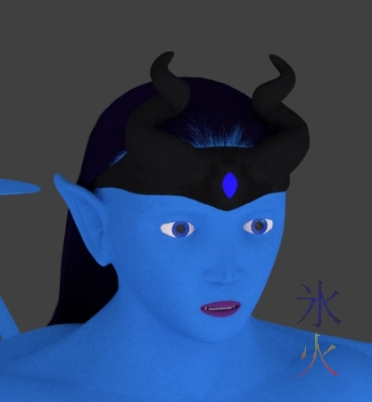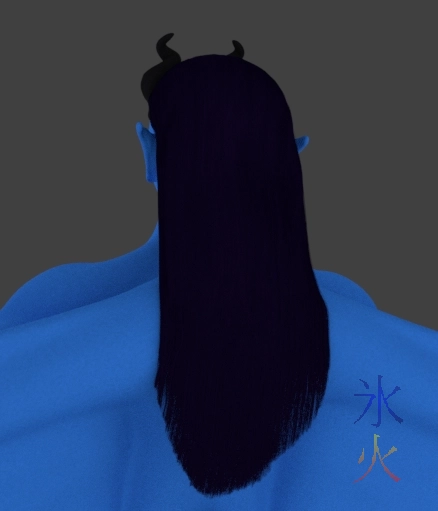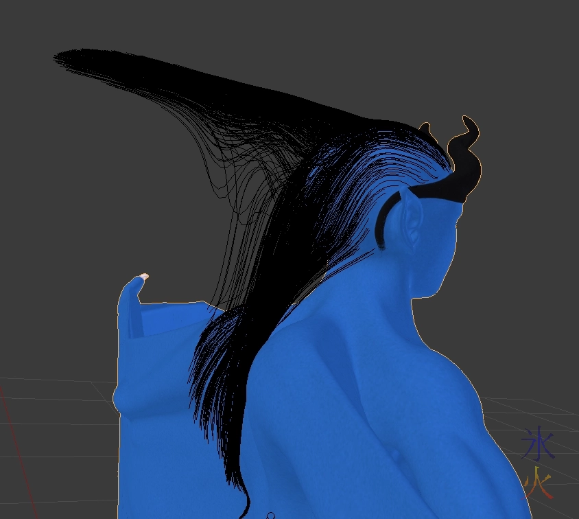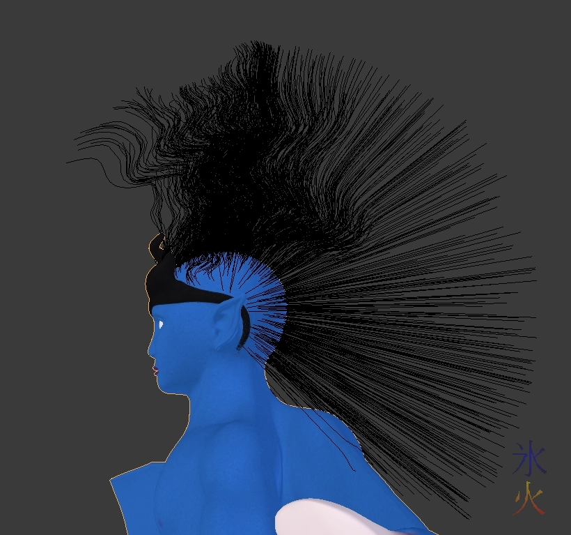 The cool thing about Blender’s particle hairs is they can collide with the emitter (the actual emitter is a weight painted clone of the top of the head where the hair would be coming from shrunken slightly to fit inside the head), though there was a bit of fun involved combing the hair around the horns. It also seems tangle together.