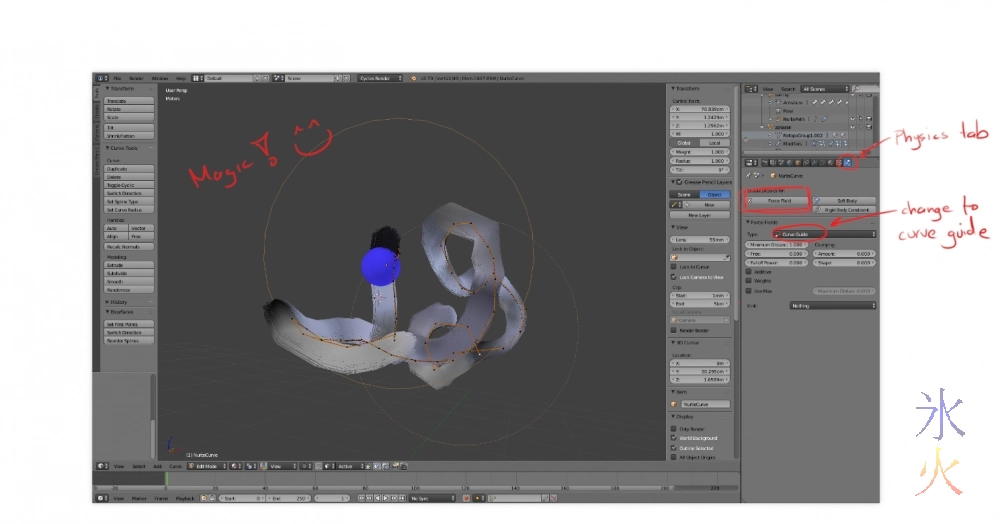 The curves can apparently be animated like soft bodies (whatever that means, I haven’t started playing with that yet) and rigged with bones. The method I’m currently using is making a chain of bendy bones and getting all the curves to use it.