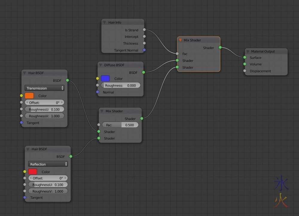 And now the bonus. With the kind of texturing I do on my characters, I need to do the hated separate emitter mesh method (ie copy the top of the head where the hair is going to be growing out of and shrink it slightly so it fits inside the head and make that the same colour as you want the hair). If you have more cartoony characters you might be able to get away with setting up a node tree something like this on your skin material: