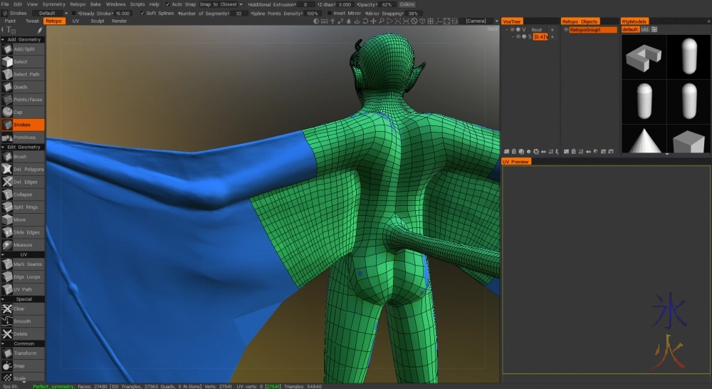 Red is going slowly, but at least going. I’m trying to get the quads on the wing membranes as squareish as possible because they’ll probably be moving a fair bit and in the unlikely event I attempt cloth dynamics on the wing membranes (seriously if I attempt cloth dynamics I’ll have to redo the wings).