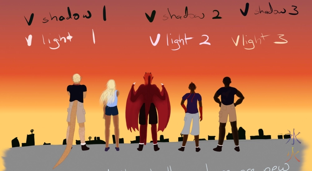 and started on the last…er…frame I guess even though there’s no border. It feels a lot harder I guess because I can’t remember ever doing a coloured piece with more than two characters (hell I think last year was the first time I ever did a piece with more than two characters and this one beats that one by one). I also realised I forgot Zara and Dak’s tattoos so will have to remedy that before proceeding too much further.
