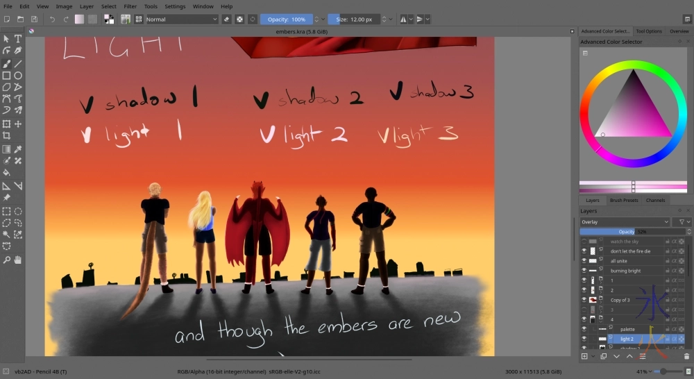 I would like to say I divided time evenly between Embers and Dance evenly but I spent a lot more time on Dance, if I had divided the time evenly Embers would probably be finished. Today was a bit of a crazy day so I ended up concentrating more on Embers as 2d requires a lot less concentration than 3d, and after a few moments of AAARGH THIS ISN’T WORKING it started working. I’ve done shadow 2 and am currently partway through light 2: