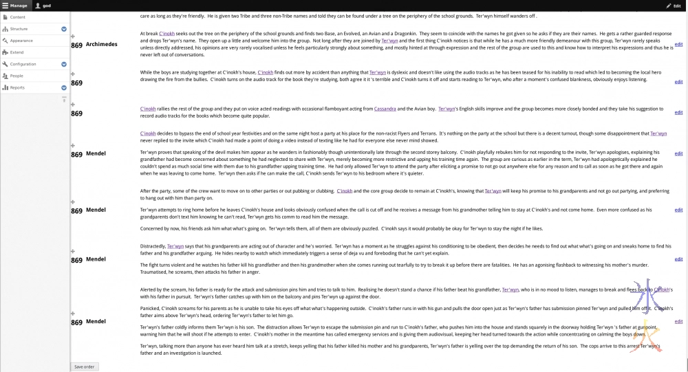 We’re still in the past but further along than I was before (which was back in the 200s in Nov ProgBlog #1 from last year jeez seriously deja vu XD). I had to do some Views fiddling of the sorting importance to make the rows stay in the order I wanted them in, and will probably start doing some prettification work as breaks in the not too distant future as there are some ux things that are really starting to bug me (such as the link content modal not being big enough) as well as sheer ugliness making some things hard to read, I mean look at this.