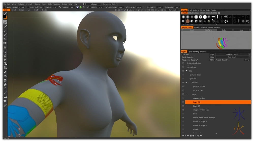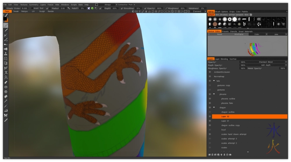 Progress-wise, well. With the scales I was really going out of my way to avoid drawing them. I figured once I got the hang of the scale brush everything would be sweet. Well I decided eventually that I would just see what drawing them would look like.