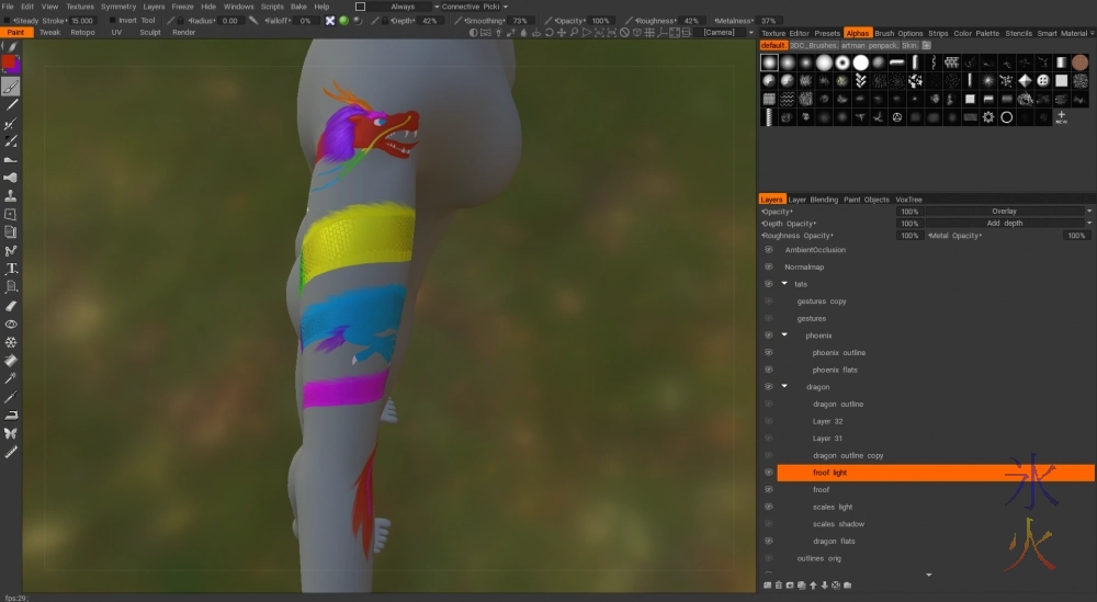 posted on: Friday, 12 July 2019 @ 10:00pm inFinally finished the gloss map for the scales! The belly scales were fairly boring and straightforwrd but I was still glad to be done with them XD Currently lighting the froof and am much happier as I like doing hair. Quite pleased with how it’s turning out so far too.
