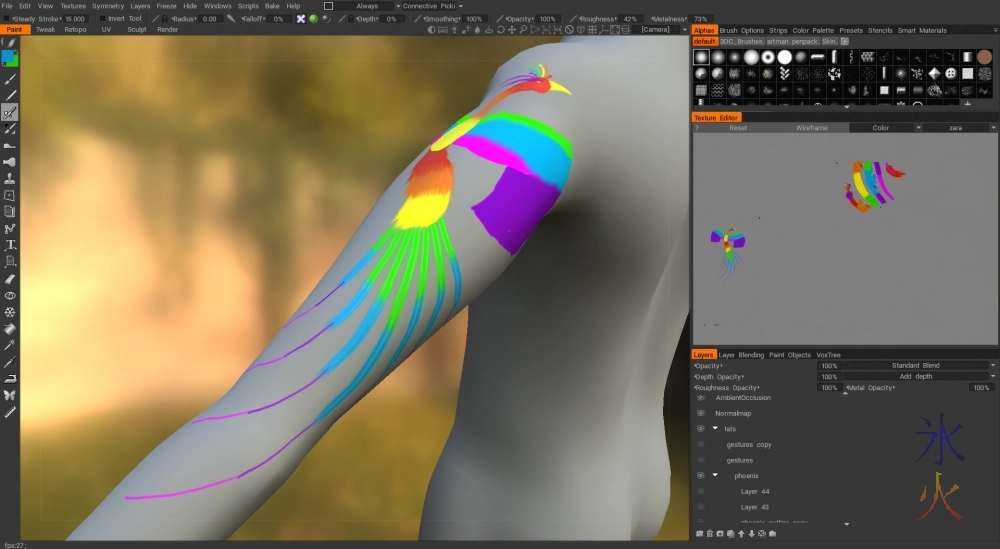 So after making some good headway on the tail feathers from last progblog, I eventually realised (again why could I not do this earlier) that they weren’t flowing with the arm direction and when the arm bent the feathers around the elbow were doing to kink horribly. Not only that the flow of the tail feathers didn’t make much sense given the overall shape of the phoenix.