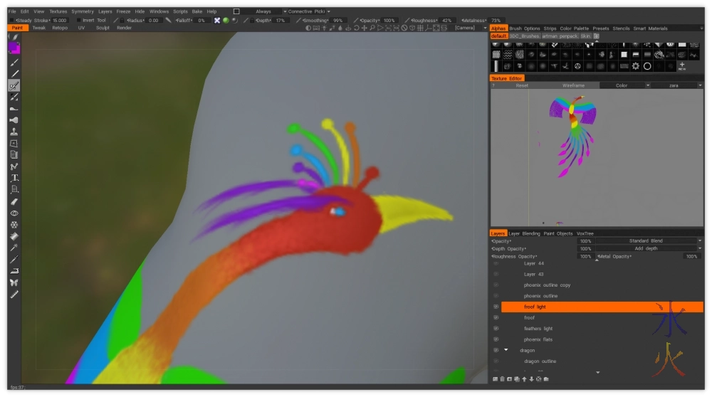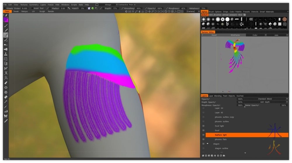 I’m not sure where I got fixated on 10 primaries, I think it’s because that’s how many I chucked onto my Avian base model because that’s how many fit with the feathers at a sensible size. I was having a lot of issues with the wing sizes and feather spacing on this tattoo and eventually decided that 9 primaries spaced better than 10 so knocked the innermost feather off on each side.