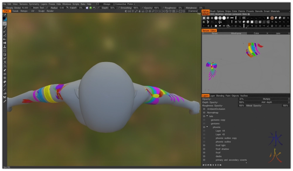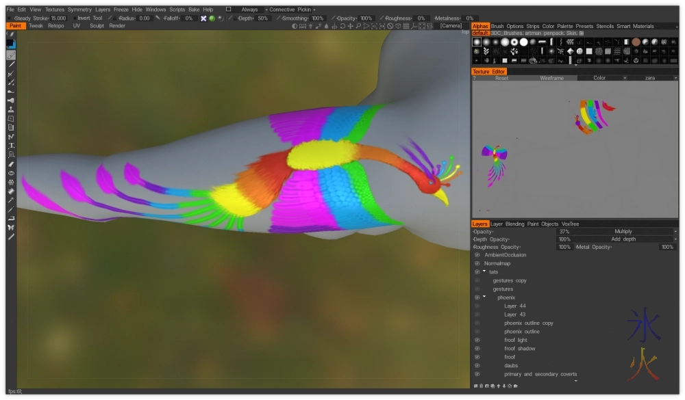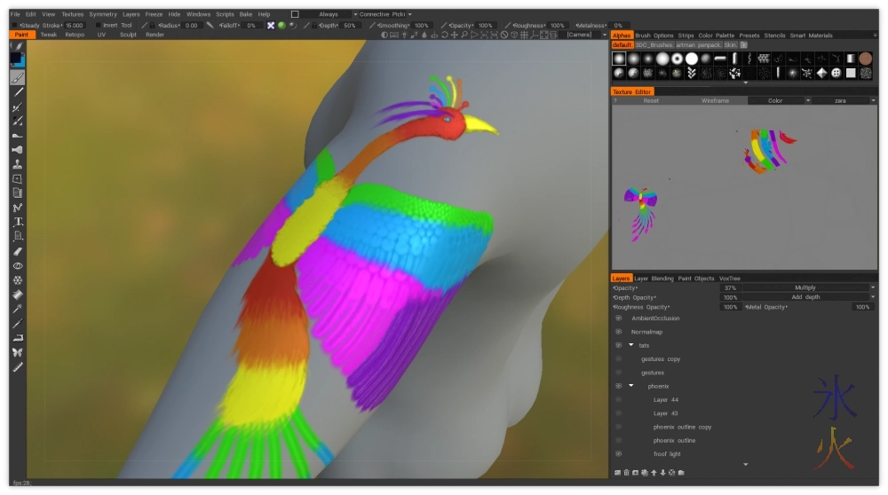 Finally finished the phoenix tattoo! Well I’m pretty sure it’s finished anyway, I’ve dropped shadow layers on the body and the froof and after some playing around decided the wings and tail feathers don’t need shadowing.