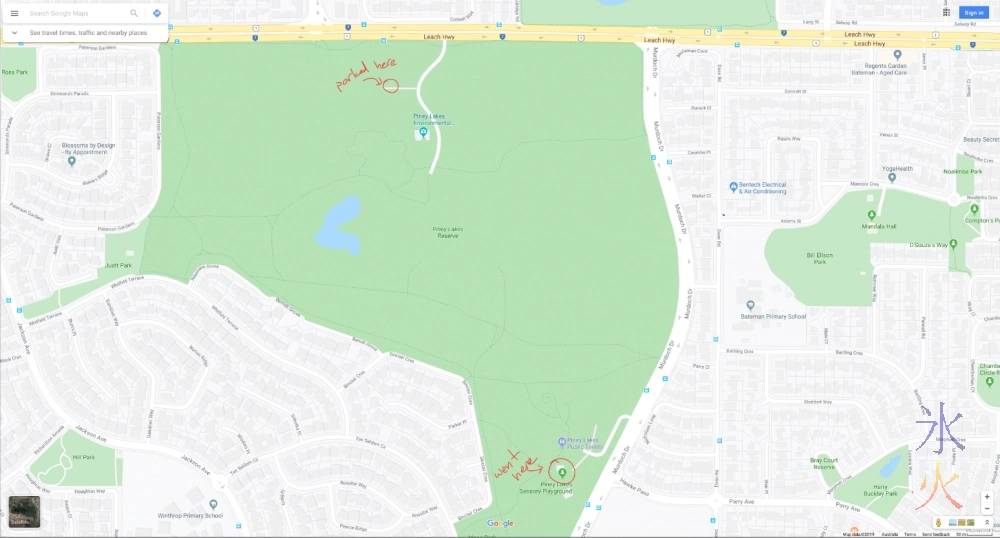 While trying to think of something to do one day I remembered a nice park in Melville that I’d taken the kids to 5 or 6 years ago, so decided we could go there and do one of the bushwalks I vaguely remember seeing afterwards. Unfortunately the day we went managed to coincide with a cross-country carnival between a bunch of primary schools so we ended up parking all the way over on the other side and hiking across the park.