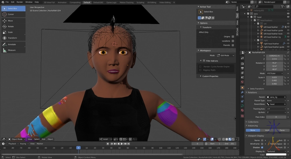 Speaking of the head feathers, another edit to show them off as either alphas just work better in this version of Blender or I finally figured them out. Probably the former. So I’ll be changing all Avi’s particle feathers to polygon ones which will render a hell of a lot faster and be easier to paint. Hopefully I’ll be able to use the same alpha map, though might need another one for the primaries as they’re a very different shape to the other feathers.
