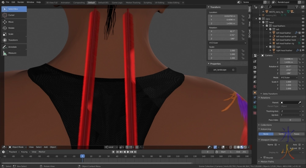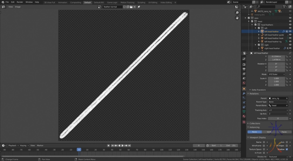 The second two were testing out what I thought was an overkill rig for the head feathers but it’s doing a decent job without me wanting to throw it through a wall. It’s rigged similarly to the prehensile tail rig and I’m trying to work out if I can be bothered testing whether it will work out fine using just the curve guide (currently there’s also a b-bone chain) seeing as the hooks have got a max distance modifier to stop them moving too far away from each other so my feathers aren’t stretching longer than they should be.