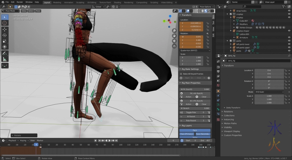 Back to the bonevelope version (as I’ve started calling the one using only bone envelopes). Currently I’m chugging along frame by frame trying to fix glitchies. This seems to be involving increasing the sizes of the bonevelopes to terrifying (but at least it seems to help prevent bones stealing other bones’ vertices) and I hope I don’t regret this XD