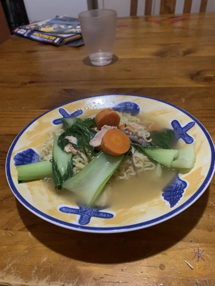 JJ discovered a brand of instant noodles in Spud Shed called Fuku (many people have probably already guessed how he remembers the brand) and 15yo and I immediately fell in love with it, so he stocks up whenever he sees it. 15yo watched me throw together what was standard starving uni student fare (and is also comfort food for me) and realised just how effortless it is to balance out a lazy meal (pretty much what the instant noodles are) and has been adding buk chui and either canned fish or any leftover sliced meat his brother hasn’t eaten all of to his bowls since. In this case I think there were bits of leftover roast that went in.