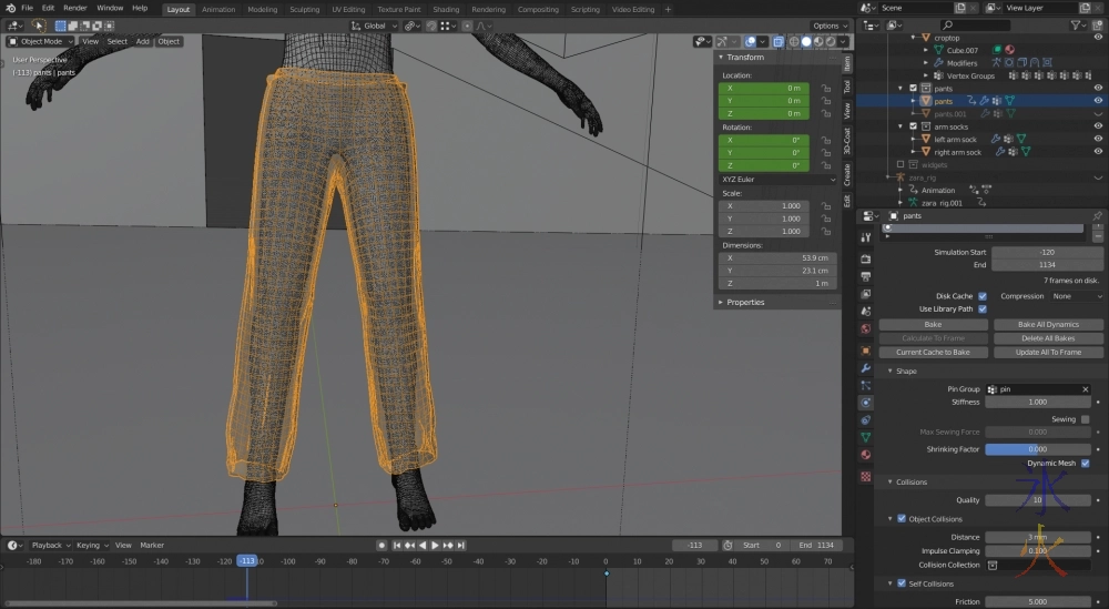 A lot of settings were tweaked and the computer rebooted twice (once unintentionally because it crashed and once deliberately after a system update) and I got something that seemed to be doing what it was supposed to be doing. Also trying a new thing where I took off most of the weight maps (aside from the pelvis ones which are where my main pin group around the waistband is) from the pants so they’re mostly driven by cloth dynamics rather than both armature and cloth dynamics, and waiting and seeing if I have to put the weight group back around the bottom leg holes as I put the pin group on them with a strength of 0.5 so they’d hold shape a tiny bit better (or at least that’s the plan with my current understanding of cloth dynamics).