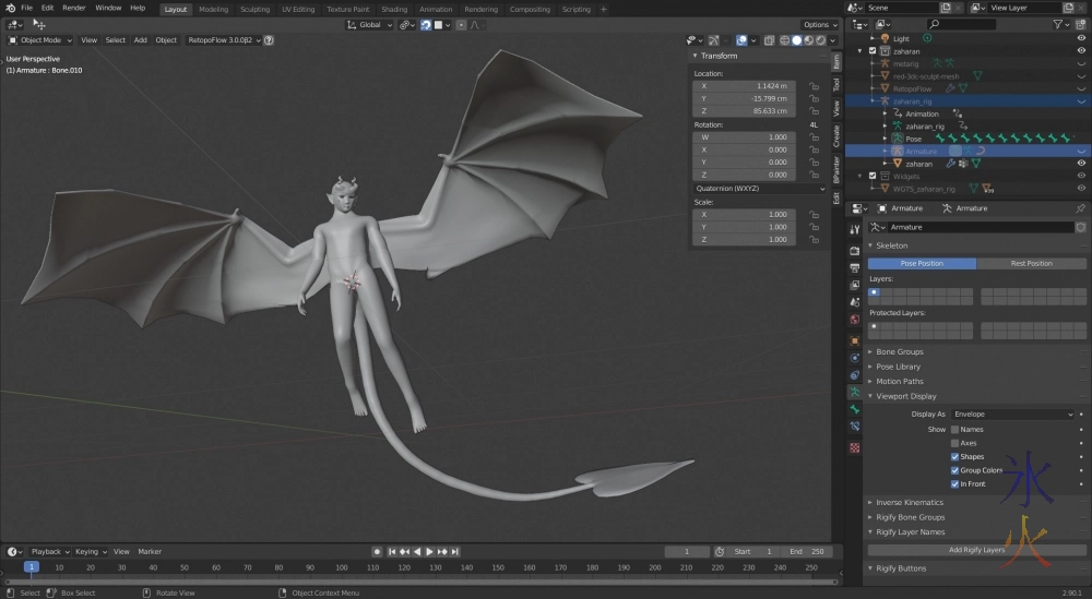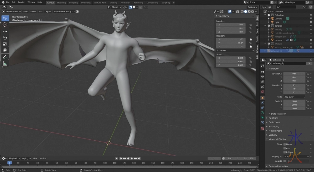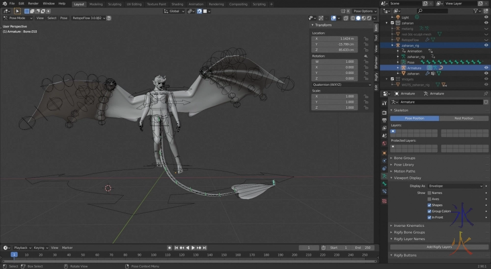 I need to regenerate all my rigs and organise the Flyer ones nicely too. I was deleting and regenerating a lot in my tests, and kept overwriting instead of making new ones so ended up with a bit of a mess whre rigify didn’t seem sure what should go on what layer. When I do the rigs properly I’ll make some of the controllers bigger so they’re outside of the mesh and I don’t have to make it “in front” which is an eyesore.