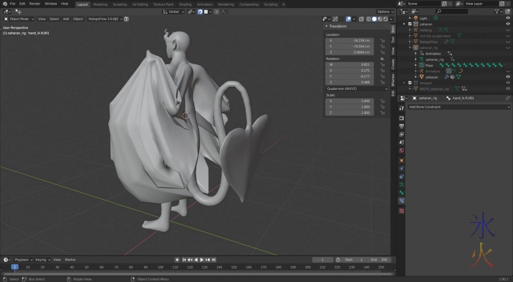 Over the last week I finally managed to finish the retopo and apparently it has 8k odd faces with the mirror modifier, more once the subd modifier gets turned on, and probably more again when I get around to applying the mirror modifier which will probably be pretty soon (after I version save XD). I then chucked a rig in it and tried it out.