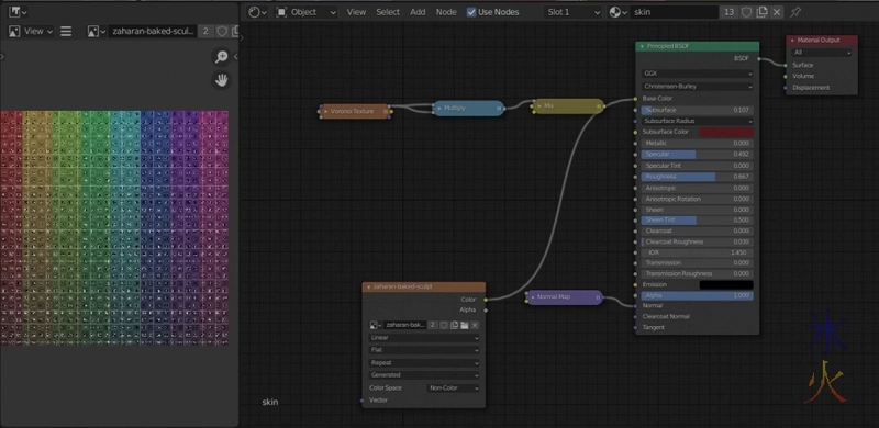 Image texturenode, select the uv map and plug it into the colour socket. Hopefully the colour grid (or the normal grid if you chose to use it) should now appear on the model. The idea is to try to get the grid squares to line up as neatly as possible