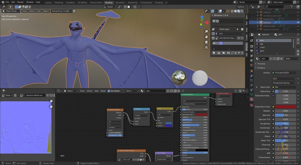 I’m currently trying to work out how to do the claws, might have to go watch bpainter tutorials again as I’m pretty sure there was a way to mask procedurals. After this is eyes and then hair and then rigging, then I’ll chuck some pants on him and jump back to Zara to see if I can’t fix her up properly, and then I’m definitely going to throw them into a scene together before moving on x_x