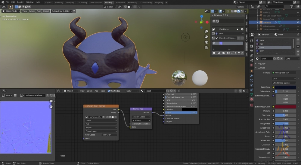 You can see the black bits on the tail and the glitchy bits on the innermost wing fingers that will need some smoothing out. The tail is done mostly by my laziness (I decided not to bother making sure the cage mesh covered it as all the tail texture was accidental anyway due to me being unable to get the tail smooth when sculpting). There’s also similar glithes on the hands and the geet and on parts of the head. I basically got to a stage where I was just trying to get rid of the glitches in the heavily detailed areas like the horns and any glitches in smaller areas I figured I would smudge over in straight texture paint (which I really hate) or figure out how to edit in bpainter (I did kind of figure it out but I couldn’t remember how I’d gotten it to just paint the normals before, it wanted me to colour pick all the way through last attempt where I probably did something wrong and that is a seriously uncomfortable way to work).