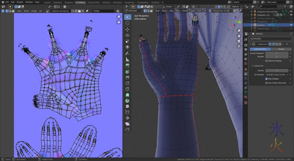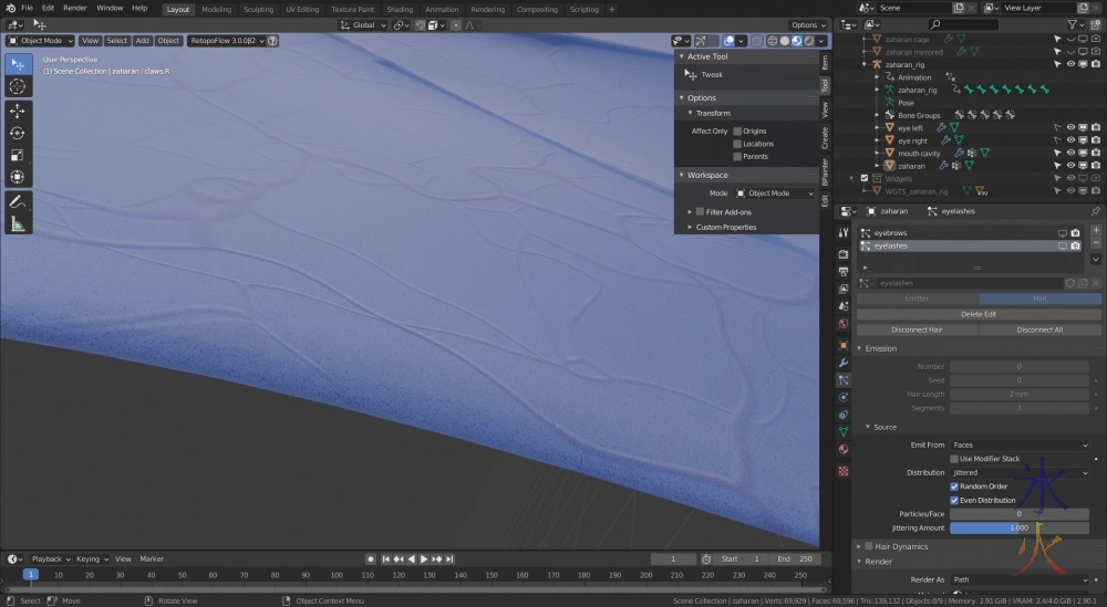 I have also since turned down the subsurface colour on those claws x_x and fixed his colour, not sure why it took me so long to realise it was offWill likely have to do some weight map corrections down the line but it’s done a pretty decent job. Connected up the mouth inside, fixed some weight mapping on it which I’ll transfer back to the default model, did shape keys (another thing I hate) for the claw retractions and now I’m onto hair.