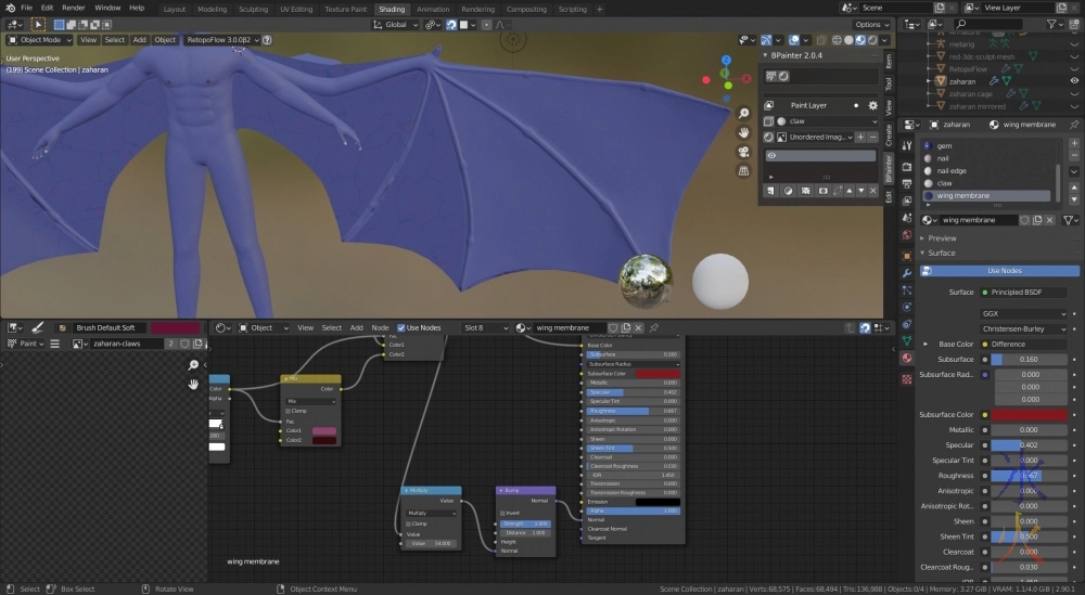 I really want to do 16k maps because yes but 8k is fine and also more managable.Got such a nice looking bake I redid the crest as well. Then followed this vein tutorial to make some veiny wings. This was briefly followed by discussing with Sprat whether I should use the vein texture or not and whether the Dragonkin should be following along with the bats they kind of have the switched on genes for or dragons which have thicker membranes that don’t usually show veins.