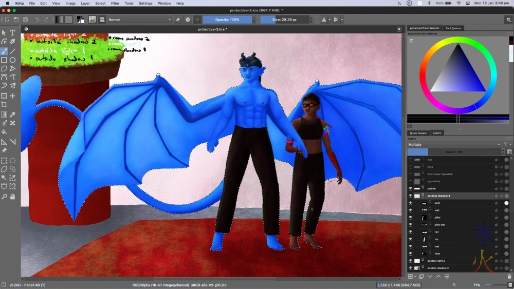 Computer is gradually bogging down with the number of layers I’m adding, hoping it will survive til the end. I’m trying something slightly different with this one; previously I’ve done three light and three shadow layers for the main light and if there were any additional lights, they just got a light layer with an opacity level depending on how stron the light was. This time I’m trying three light and three shadow layers for each light source starting with the weakest one (the plant light) and ending with the main room lights (not done yet, I’m currently on the last shadow layer from the light coming from outside). Also planned all the light colours which I’ve only done for one piece previously as far as I can recall.
