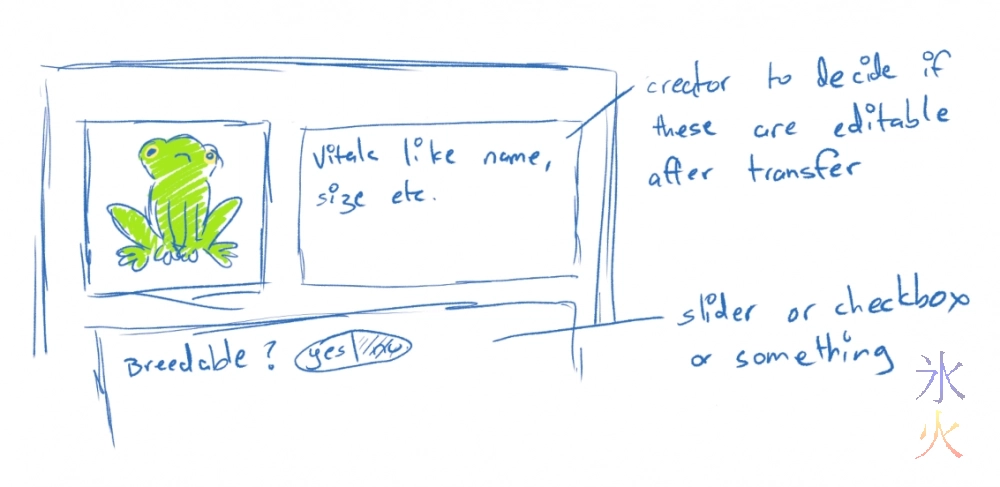 Hopefully what’s outlined is enough to interest people who are into adoptables and breedables. To attract new people and/or appeal to existing people who want more, some other ideas I had to further complicate things are:
