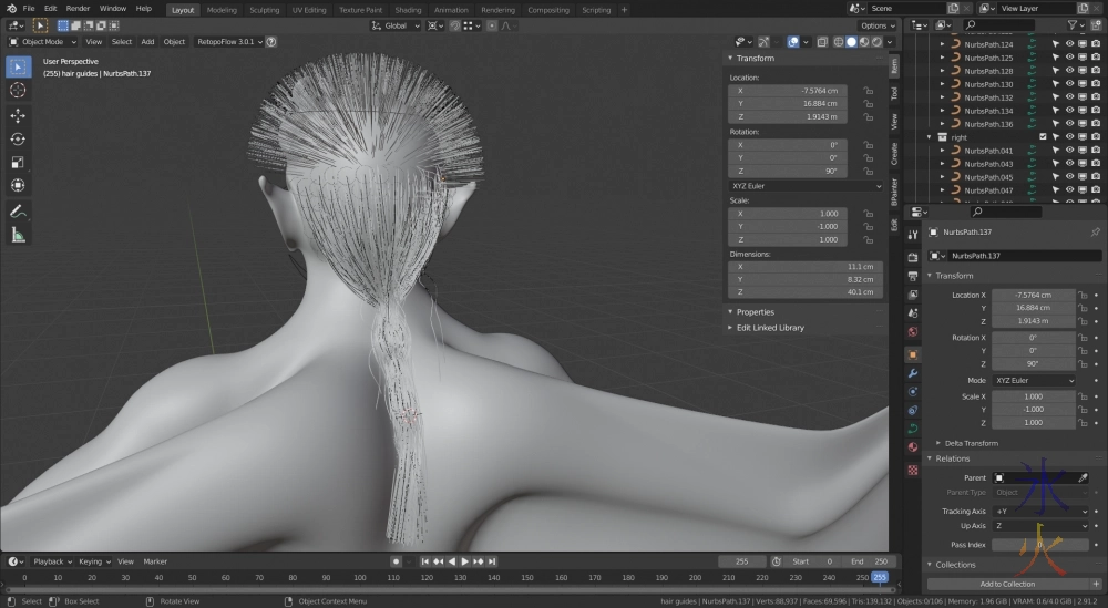 The big art block (as in block of hours assigned to art, not the art block where apparently one can’t think of anything to draw, I always have things to draw though I also tend to overload “draw” to mean whatever I’m doing at the time which is almost always 3d) was also pretty tedious, I got more hair guides done. The big art block happens during the day when I can fit it in and is dedicated to character work.