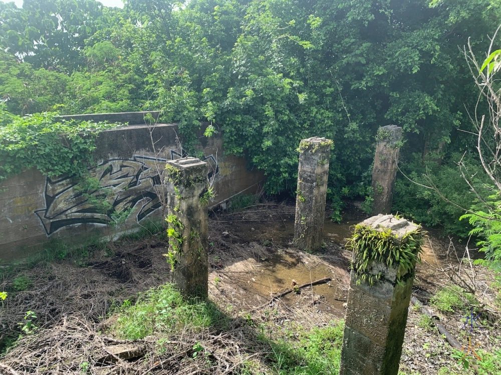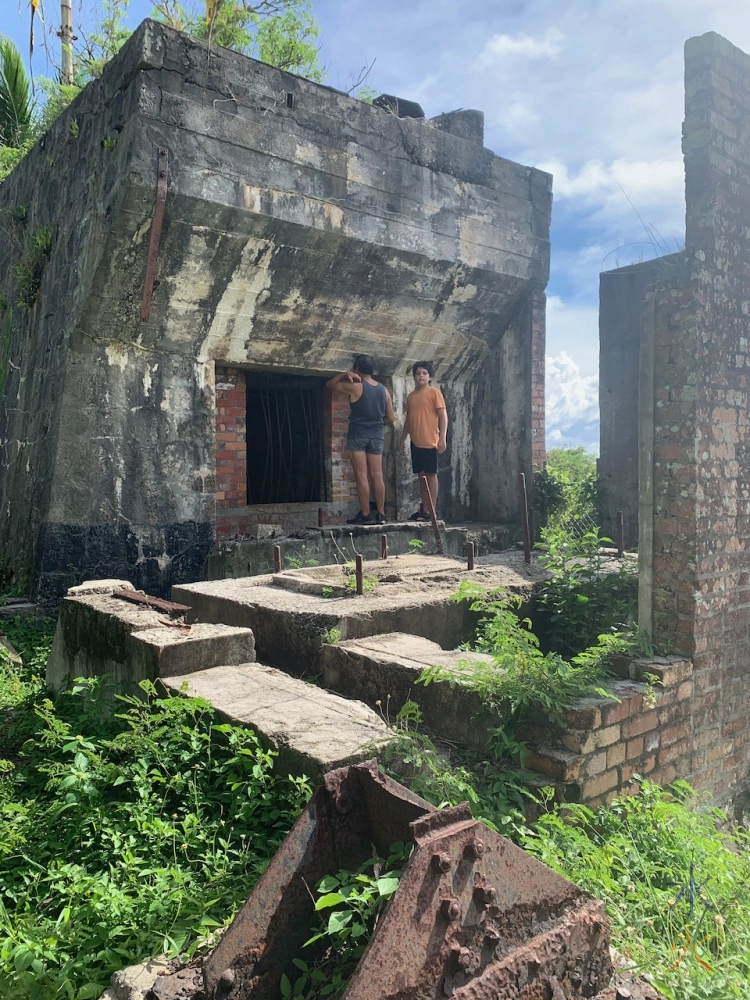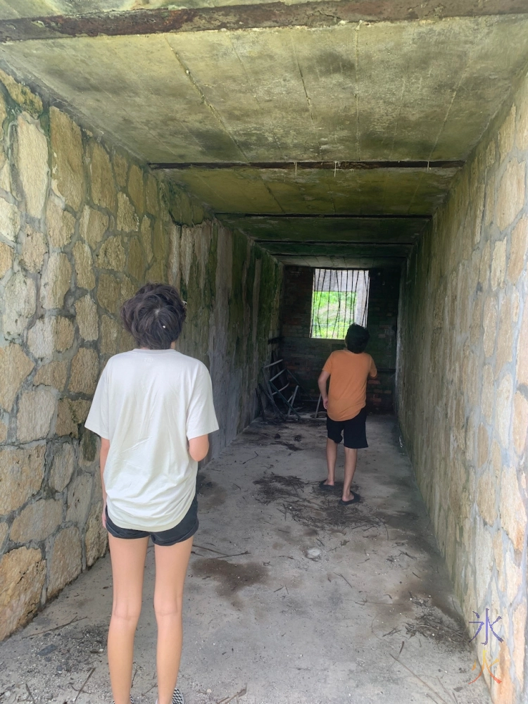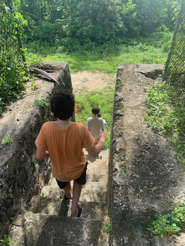 Now I’ve organised the photos in an attempt to give a vague indication of the layout of the place. How we travelled was first parking in front of the train station on the track remains where I took the first photo (14yo and Sprat in front of the wall across the way), then checked out the bunker as the door was on the train station side (back shot of 14yo and 12yo inside bunker), then went down the closer stairs (14yo and 12yo descending) and I took the two photos upwards of the train station and the bunker building. From there we traipsed on over to the house and I asked my dad what was further down the road and he replied not much (there may have been more ruins but they may have been completely consumed by jungle). We then headed up the stairs on the other side of the train station which were further from us when we started but closer now that we were going in the opposite direction (JJ ascending) and I took the photo of the small room thing that had a tree growing in the middle of it as we were driving away.