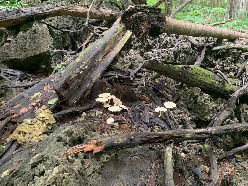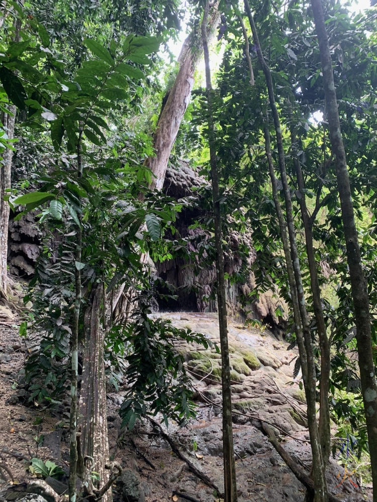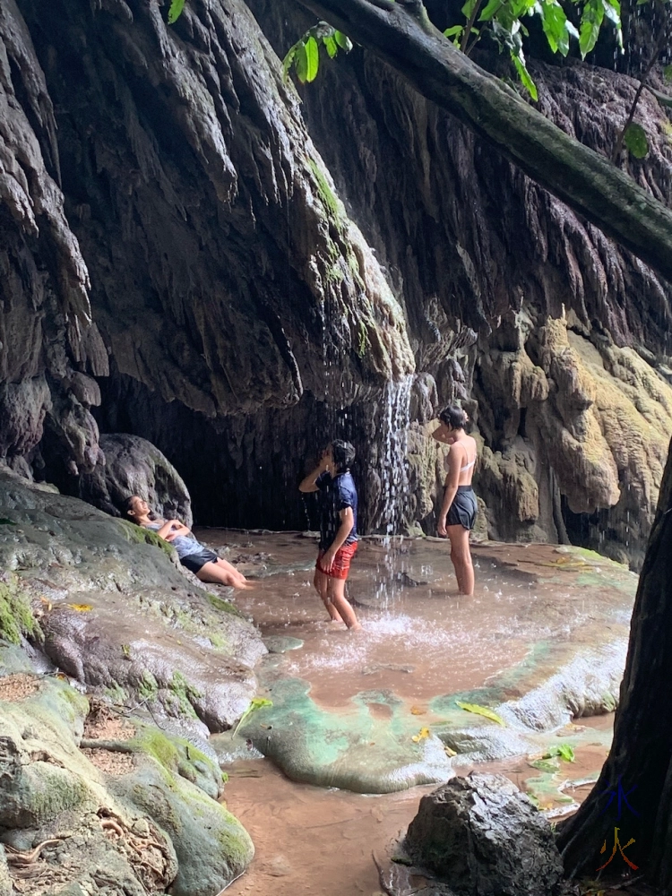 The waterfall (both the small thing visible in the photos which used to be a trickle falling onto the flat green rocks further back rather than directly into the pool, and the actual higher waterfall which is hidden behind the big tree on the right of the photo) has been moving further and further forward over time as more limestone gets deposited by the flow.
