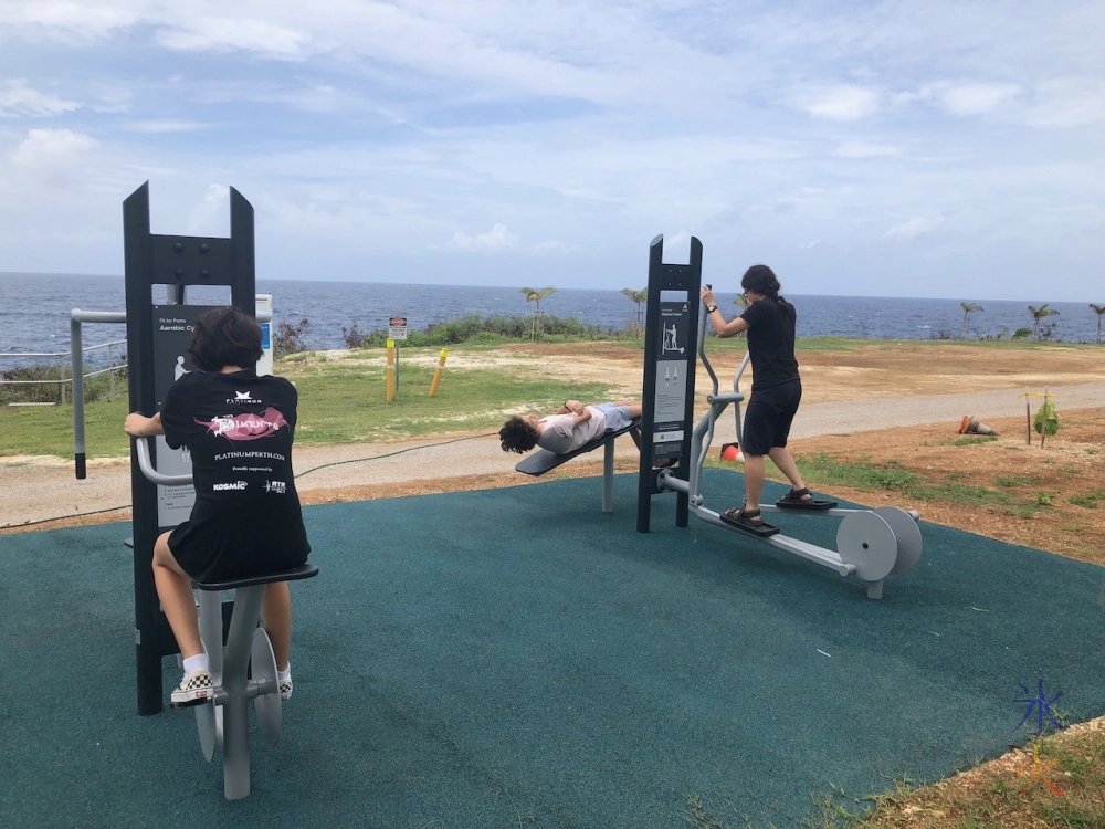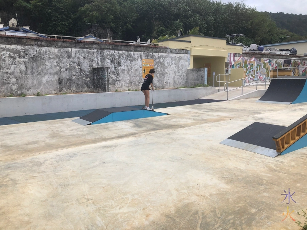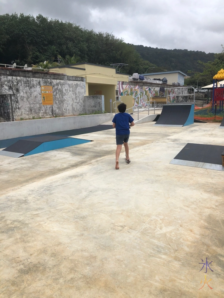 We had been told that there was a “new” (to us at least as it had been built in between our last couple of visits) skate park and exercise park down at the Settlement area, and got to check it out after hitting up the CLA for lunch as it was just downstairs from that. The younger two had a go on the “community scooter” (a little scooter that is left there for anyone to have a go on) and even Granddad (my dad) tried it out (unfortunately I didn’t catch his stack on video).