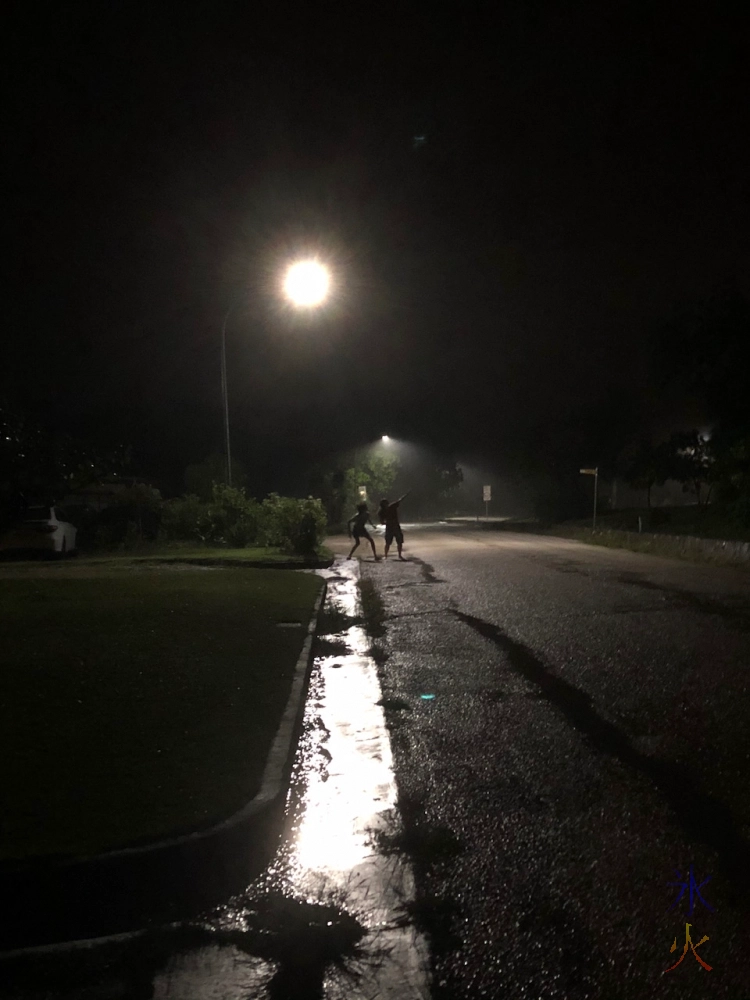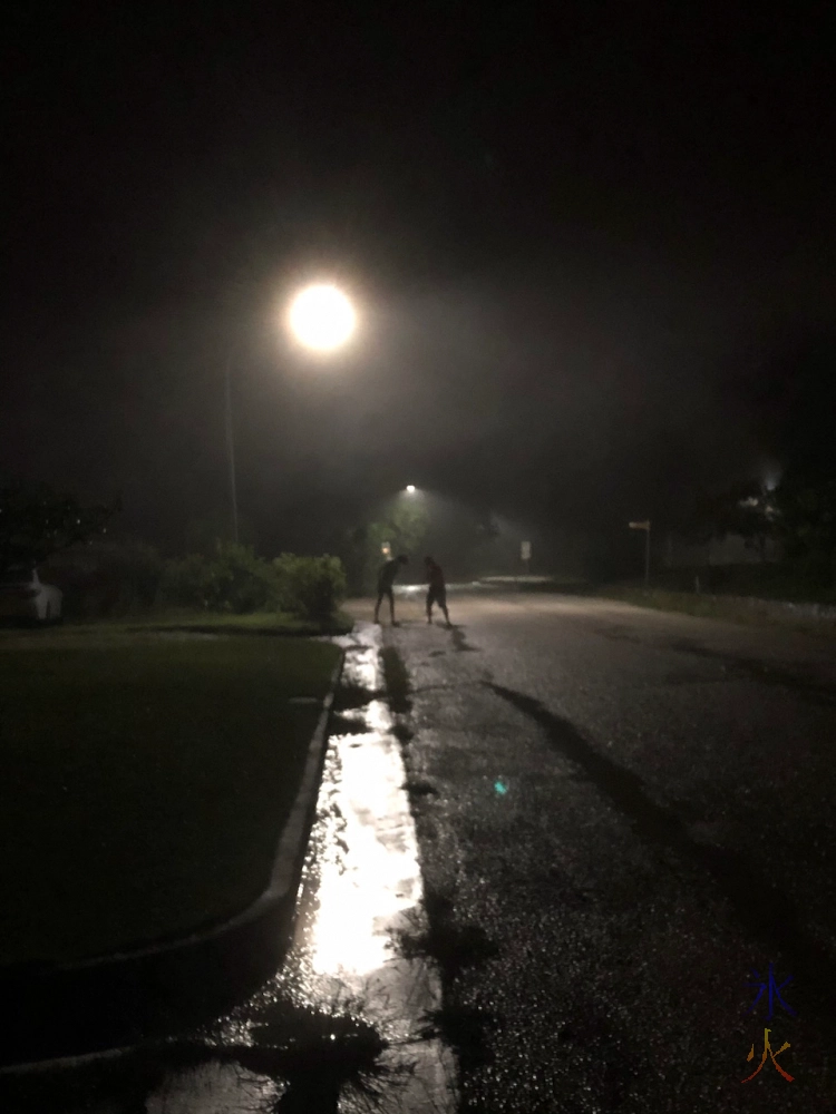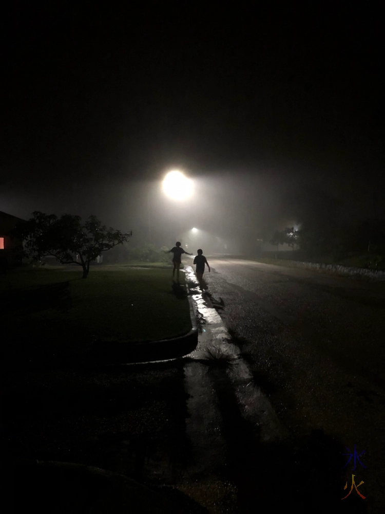 Not much later we got rained in again. It let up a little after dinner and the night looked so cool that Sprat and the kids decided to do a photoshoot in the interesting atmosphere. Sprat took this one of 14yo and 12yo running up the street.