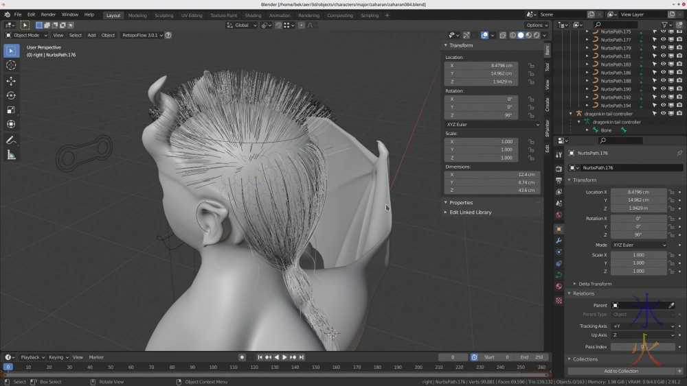 It’s going slow partly because it’s tedious (which means I will happily get distracted by anything and everything) and mostly because it’s actually slow, there’s a fair bit of lag when moving the curve guides around as it’s probably calculating where the particles are going while I’m doing it. I think I’ve only got 1-2 child hairs showing but I kind of need to see what shenanigans they’re getting up to so currently just putting up with the fact that it’s slow. Hoping when I redo this in the not too distant future whenever Blender’s new hair system drops that it will be a lot quicker and easier.