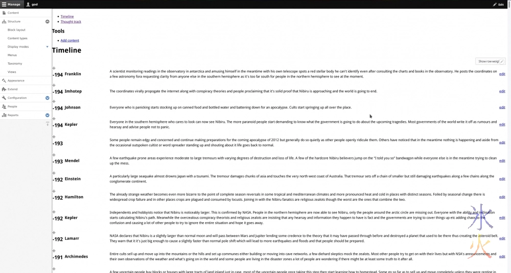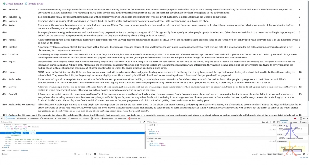 Jumping back and forth between the back and front end is slightly confusing. At the moment I’m copy/pasting so it’s feeling very slow as the “add new [whatever]” button is only on the screen where all the content of that type is listed, which means an extra button press to get back to it after creating a thing. It will probably be less of a problem when I’m casually adding more nodes. A problem I’m foreseeing is editing existing nodes as I couldn’t figure out draggable or edit in place (I’m currently just assuming I can probably do it) or even constructing an edit link (probably need to figure out authentication tokens and other such nonsense, from the “public” view which I have going at the moment it drops me on the strapi login page and then to the dashboard), which is why the eventid numbers are visible so I can track it down in the strapi admin.