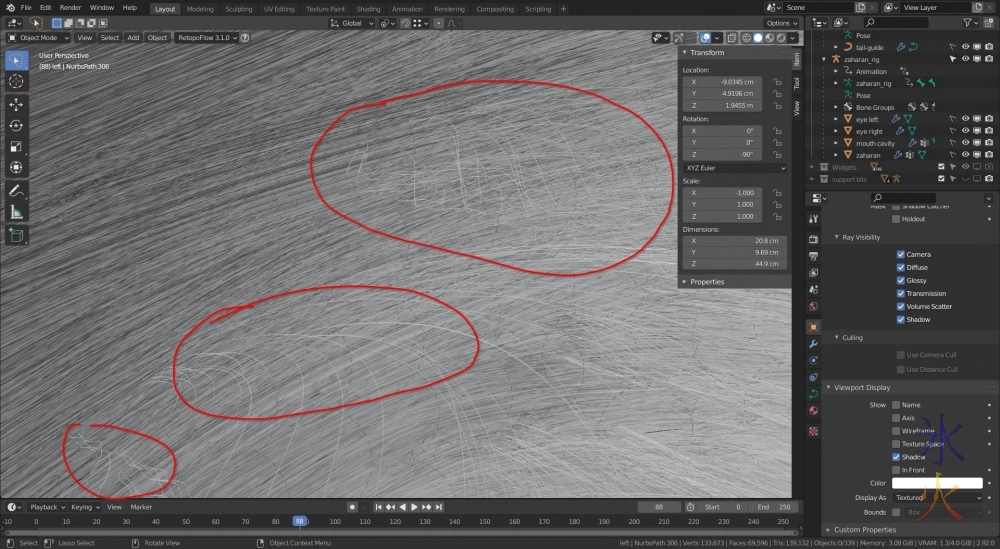 Here I am inside Red’s head looking up at the hairs. The nice neat straight bits are doing the right thing and following the curve guides. The squiggly bits that I’ve circled in red are the bits that are misbehaving. I can also see the curve guides a bit better from in here (the dotted circles if you look very carefully) so I just grab nearby ones and move them as slightly as I can manage (lag makes them move slightly more than I intend to but it usually works out in the end after a lot of fighting) until the stupid leftovers do what they’re supposed to be doing.