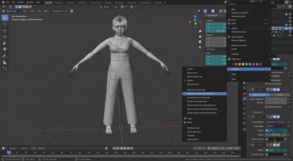 **File > Link **the character collection and the clothing objects (alternatively appending the clothing objects so they can be adjusted to fit the character properly might be a better option). Currently if you have things in collections when you do library overrides it creates new objects while keeping the old one which annoys me, so I’m making sure everything is linked into the scene collection, then right clicking and going **ID Data > Library Override Hierarchy **(or just override for single objects seems to work, there are also keyboard shortcuts but I’m not there yet) which creates the object in place.