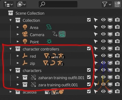Then everything is sorted into collections (the characters go in one and the empties actually go in another one that’s placed at the top so they’re easier to grab from the outliner because the empties themselves are tiny little things that are occasionally hard to see never mind grab).
