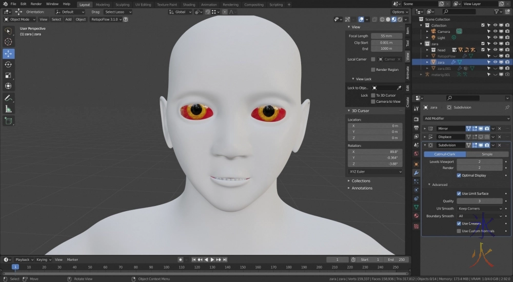 I made the eyeballs visible again and turned on the material preview so I could reposition the eyeballs into the now much larger eye socket and enlarge them if I needed to and well I didn’t need to sleep tonight anyway.