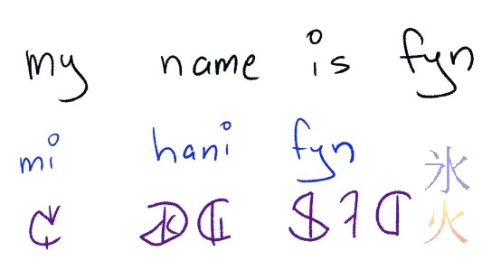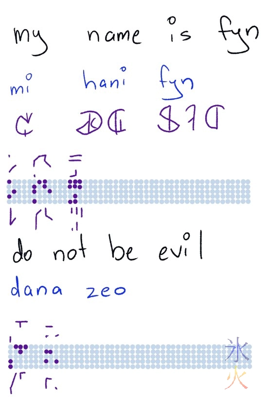 Dotsies was a lot easier to pick up writing-wise and it was reasonably quick filling in the dots (though I’ve already forgotten what letters are what x_x). I also got a reasonable looking script just drawing the shapes (which were also done on a grid which I hid to see what it would look like on “blank paper” though I imagine in my head-universe dot matrix grid paper would be as common as lined paper when they wrote on paper and most of them write on tablets anyway which would probably be quicker and easier).