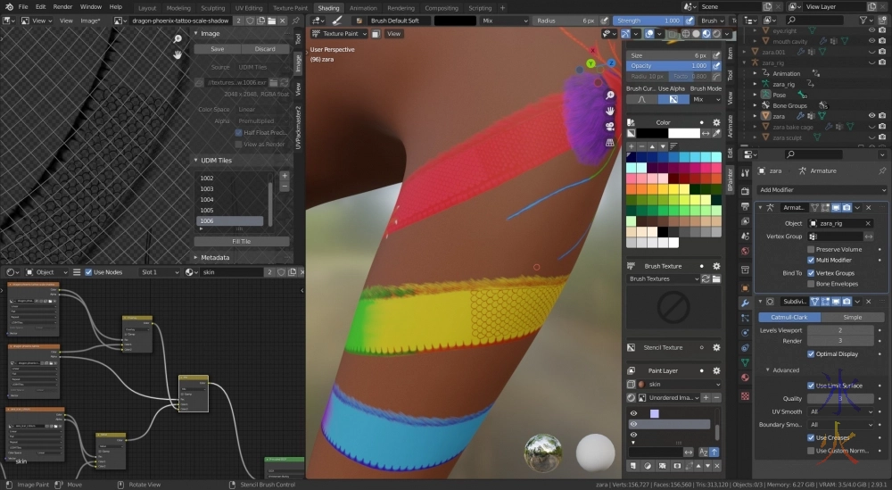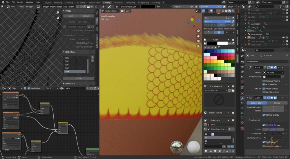 The scale drawing is coming a bit easier now that my hand is used to drawing the scale shape again and also now that I’ve managed to convince myself to stop trying to make each scale exactly the same shape and soothing myself that I will be able to fix most of the problems I can see/am causing with my inability to draw in the shading/gloss map and the fact the camera is unlikely to ever get as close as I’m getting. If I’m not too distracted trying to finish a certain character portrait over the weekend I’ll try to smash more out.