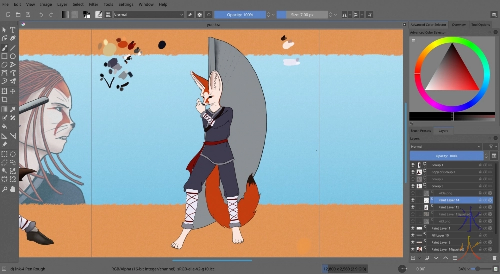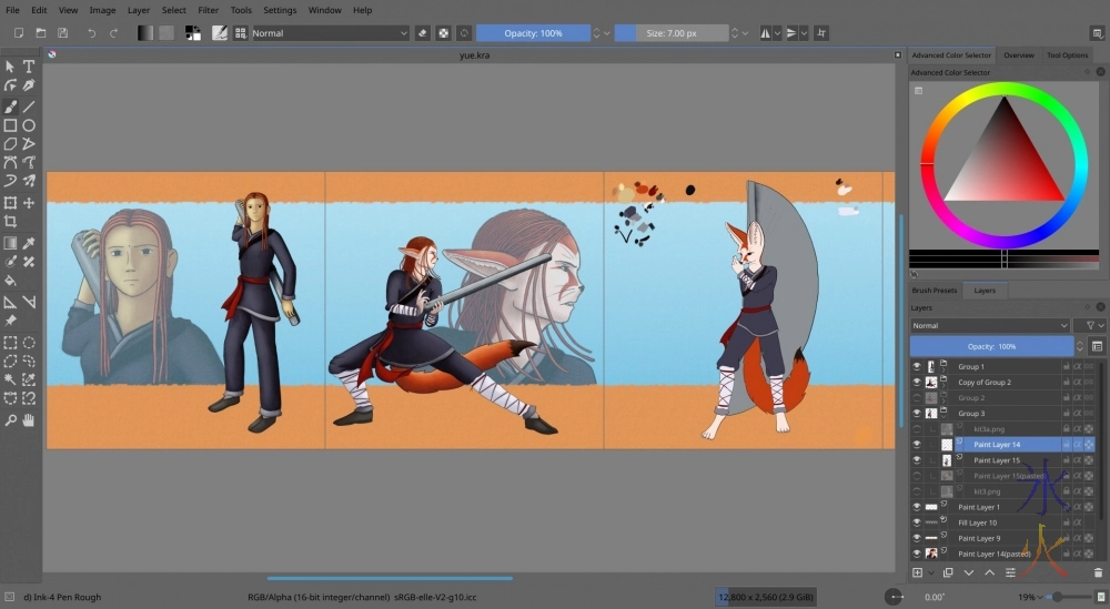 I was also trying to vaguely emulate the character sheet and make them roughly the same scale (unlike the other Changing Breeds who have massive crinos forms, the Kitsune don’t really change size much and the crinos/Koto form is only slightly bigger than the other forms) but some dumbarse (not me at all >_>) decided to open the stupid airfoil for the Koto form and it was too big and I’ll have to either shrink the other two or just ignore the scale and just make each “frame” (because the black lines are guides that won’t actually be in the final) work on their own. As the fox form is tiny (because Fennec foxes seem to be ankle height) and wouldn’t take up enough of its square I am going to do the latter.