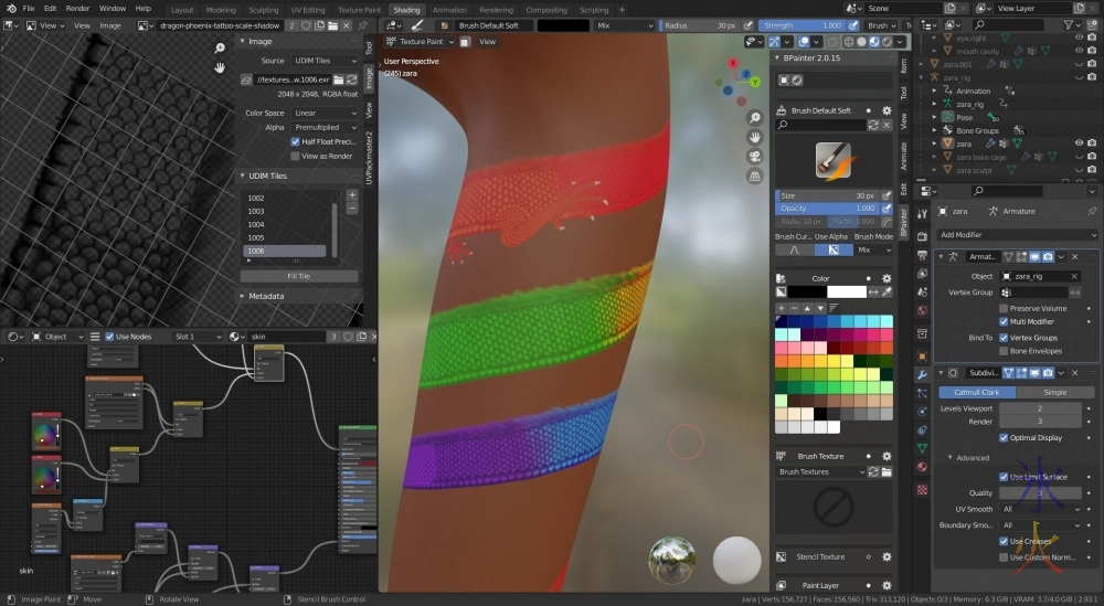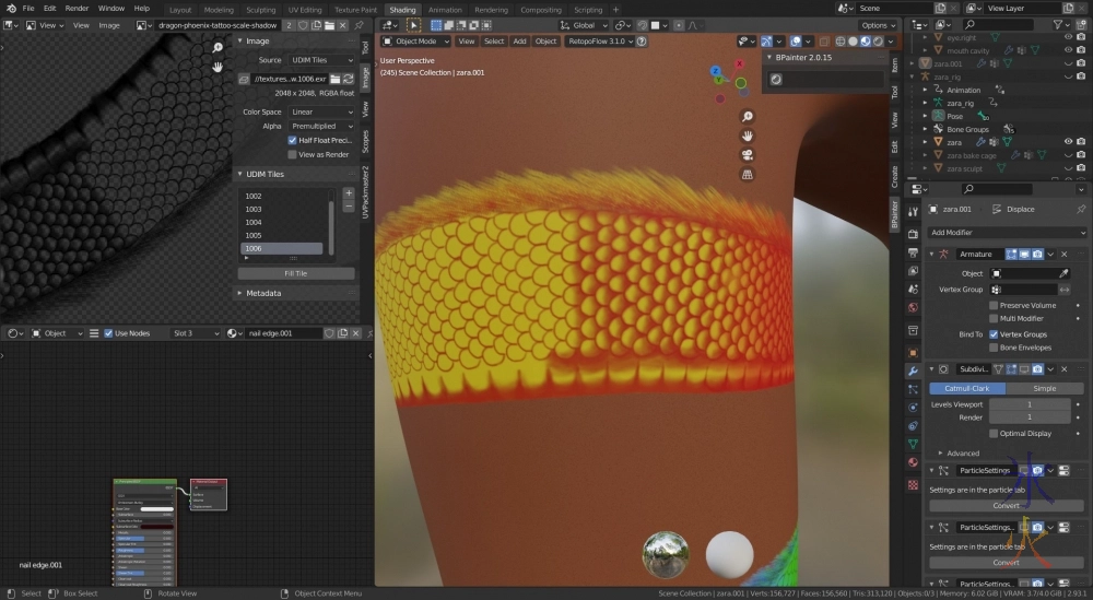 While I was doing this I found out that UV Packmaster had stopped working at some point probably because Blender had updated, so I updated that, and have to buy a newer version of the engine which is not expensive but currently annoying because it’s not something I can do immediately because all my money kind of evaporated because children insist on having growth spurts and it’s comp season. So I just used the internal packing algorithm because it wasn’t the biggest deal for this model but its inefficiencies still annoyed me.As the GM and I were discussing look he mentioned something about normal mapping Gundry’s scars and I said it wouldn’t look great with the toon style shading, and showed him what Zara’s bump mapped scars looked like (done as bump rather than normal because I know how to paint bumps whereas I only know how to sculpt and bake normals).