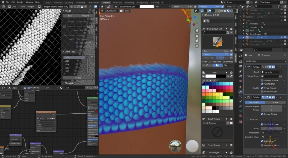 Anyway I finished all the scales and I’m making hairs shiny now. When I started writing the progblog I was in the pretty blue section.