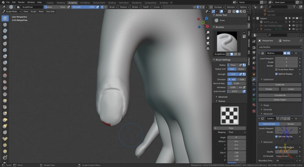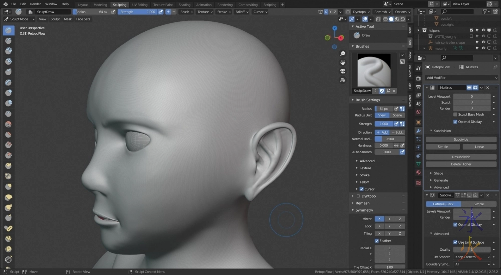 Seeing as I have decent topology now, it’s so far working out a hell of a lot better, as my tests (which I didn’t screenshot) on the base mesh’s hands seem to indicate. As an experiment I versioned Yue and pretty much started again, using a subdivision level of 3 (which I think is what the subdivision surface modifier is on anyway) and it’s actually going okay.