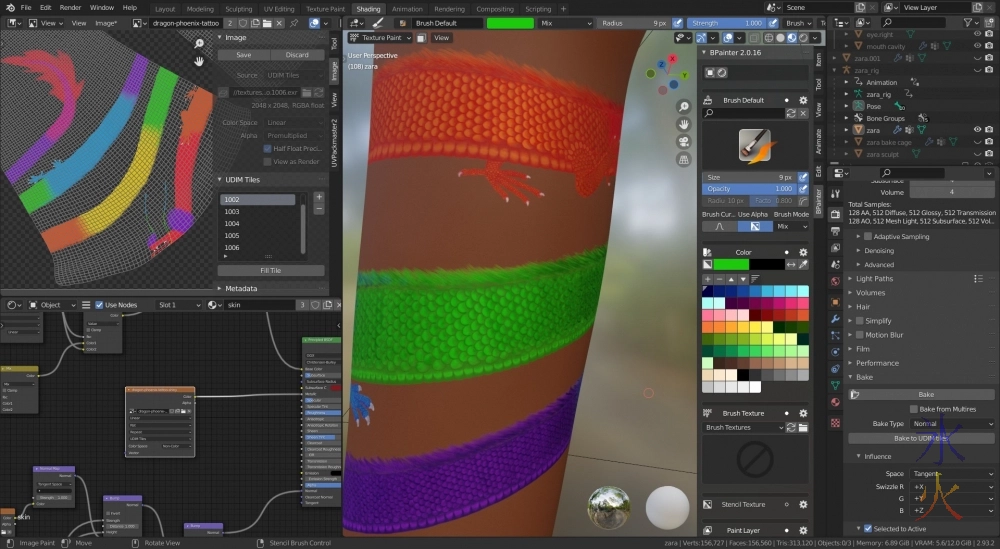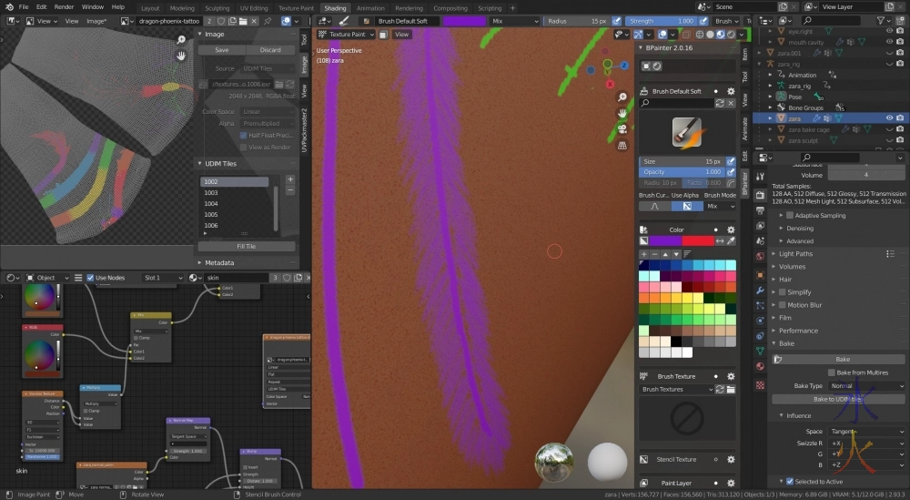 After switching back to the colour map, I attacked the shape of the dragon tattoo, adding in these little belly scale segmentation things.