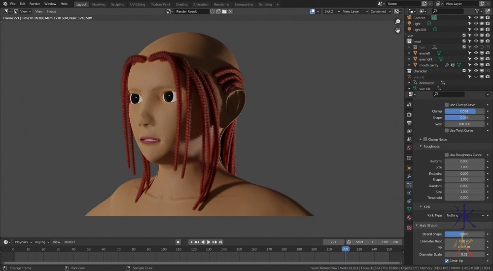 However as I was getting to the crown (where I have the most trouble with hair) I suddenly realised (thanks to noticing how short some segments between control points were shorter than they should have been) that the interpolation setting had been a little too good at its job and was interpolating some strands a lot shorter than they should have been, so I’m back to placing and manually adjusting the strands once more.