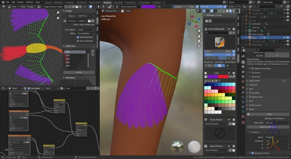 I have also finished primary feather flats on one wing of Zara’s bird tattoo